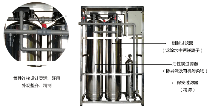 設備組成【根據(jù)用戶需求定制】:自動控制閥、不銹鋼樹脂過濾器、不銹鋼活性炭過濾器、保安過濾器、鹽箱、電控柜、不銹鋼座架、連接管件、樹脂、活性炭、軟水鹽。