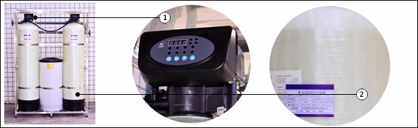 設備組成:自動控制閥、玻璃鋼樹脂罐、加藥鹽箱、連接管件、軟水鹽、陽離子樹脂